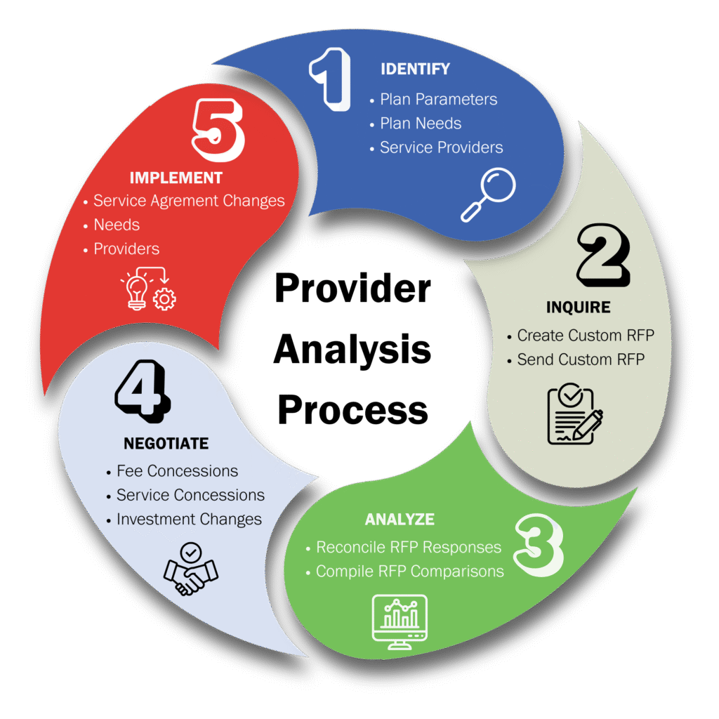 We highly recommend that you undergo a complete RFP analysis every 3-5 years to ensure that your plan is priced competitively, as well as making sure you are receiving benefits from your provider that are comparable to your peer’s benefits. As an example, we see it all too often where Company A was not offered the same Education and Financial Wellness program as Company B, simply because nobody thought to ask or negotiate on Company A’s behalf. Our benchmarking and RFP process will help determine what areas of improvement exist and gives us concrete data that helps us negotiate services.